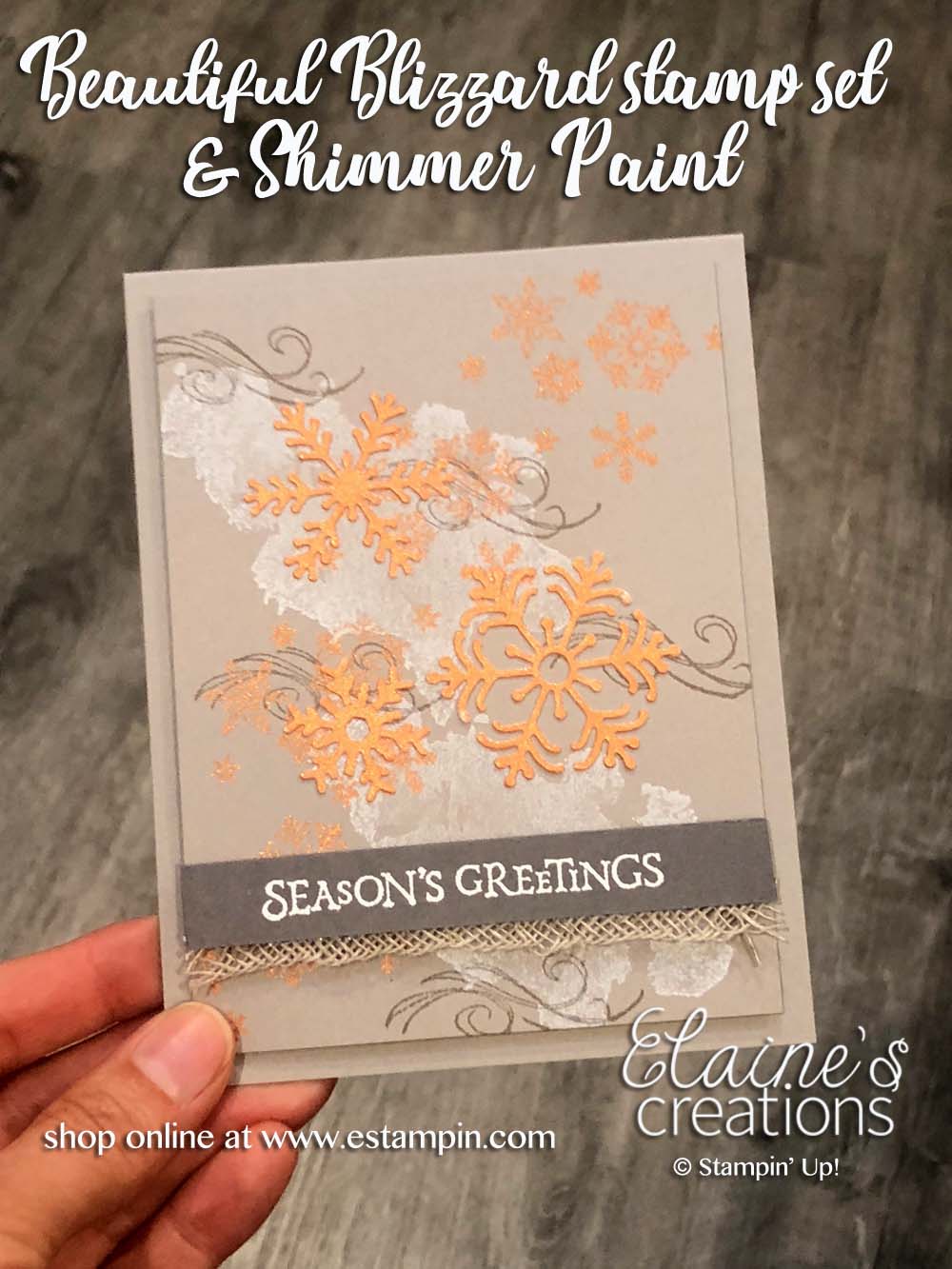 Use shimmer paints as ink on stamps! For this card, I used sponge daubers and shimmer paint to paint the ink on the small snowflake stamps. Then I cut out the large snowflake stamps with the Blizzard die and used sponge daubers to color the snowflakes copper. The new braided linen trim is fun to pull apart to create a stretched look. I’ll show you one more way to use shimmer paint in my next blog post this week.