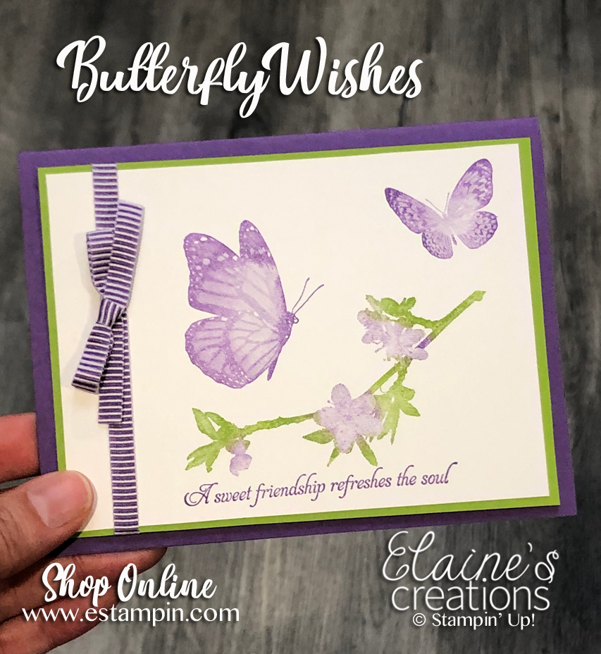 I used sponge daubers to ink up the stamps in multiple colors. I added some Gorgeous Grape ribbon to finish the card.