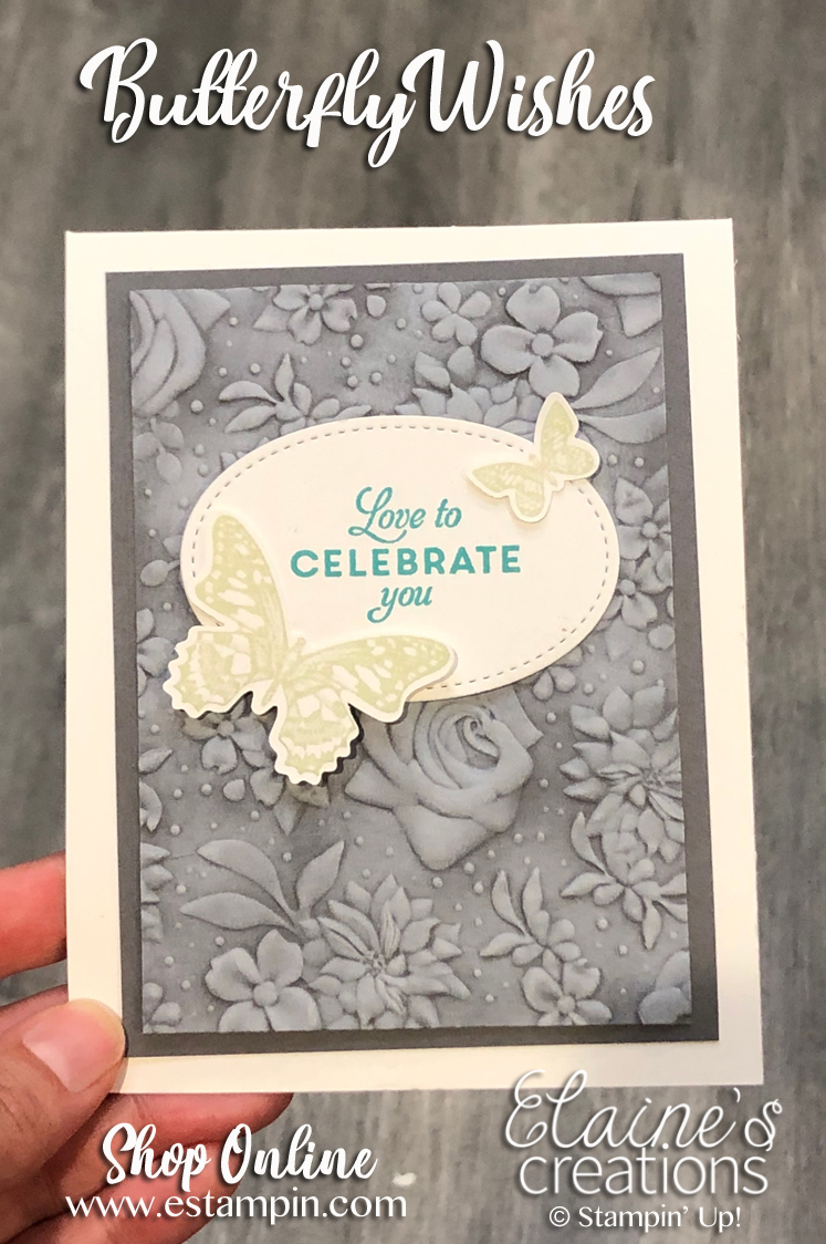 The Butterfly Wishes stamp set coordinated with the Butterfly Duet punch! Create a white washed background by rubbing whisper white craft ink on an embossed background.