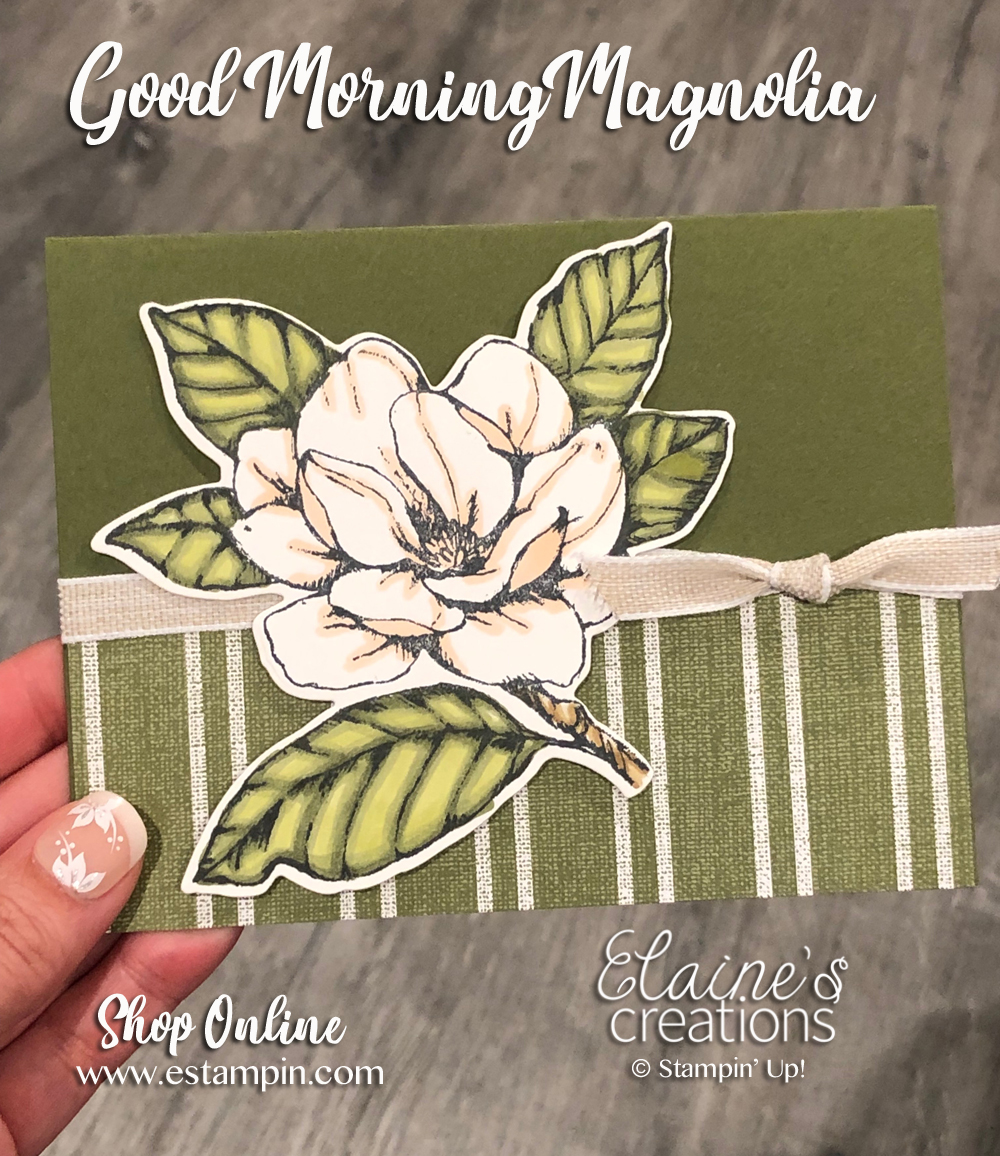 Magnolia Lane is one of the very first suites that caught my eye in the new catalog! The beautiful large magnolia is perfect for coloring.  The coordinating Magnolia Lane Designer Series Paper and ribbon beautifully coordinate with the stamp set in the suite!
