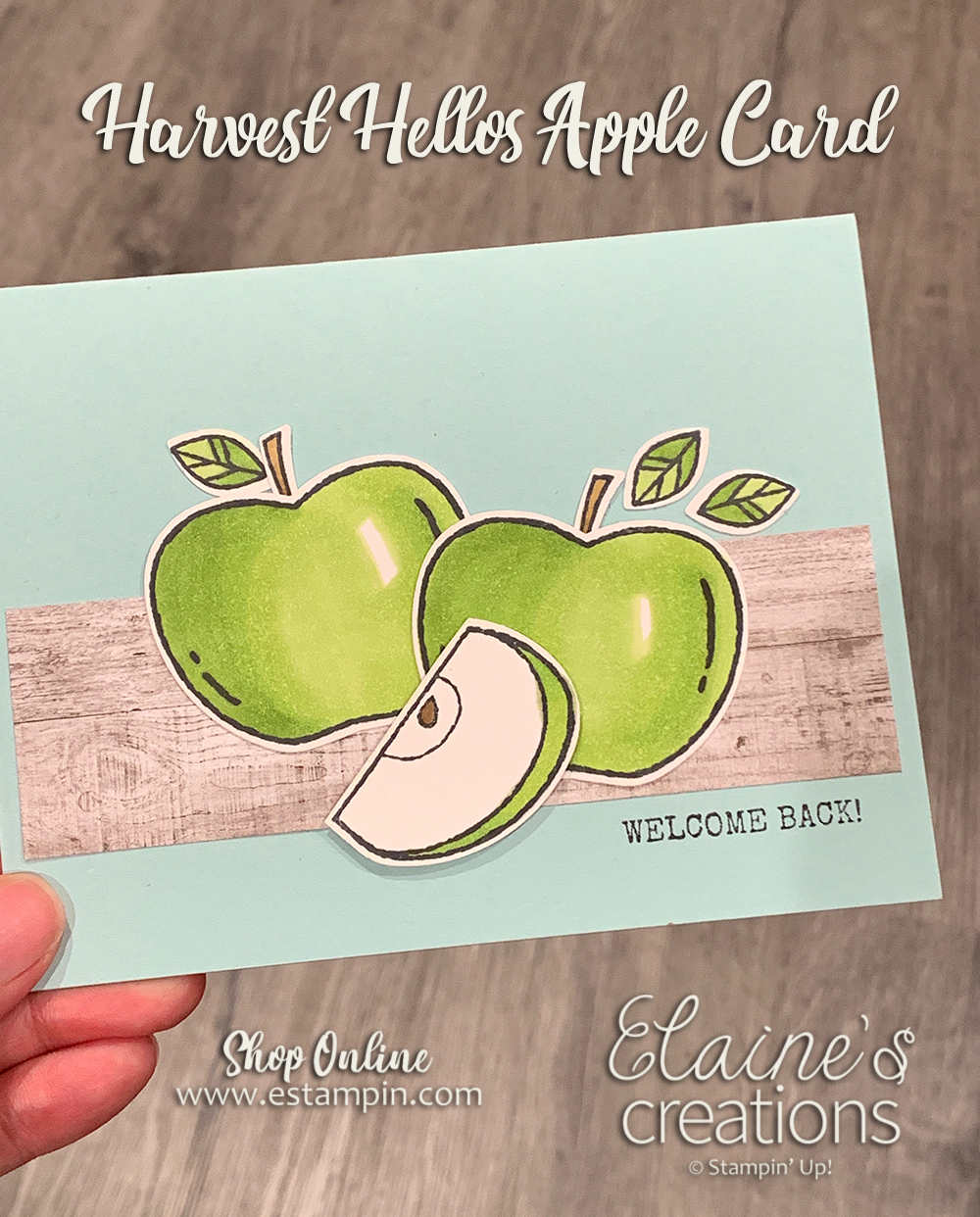 Green apples are my favorite. I love each crisp crunchy bite of sweet and a little sour and that they are perfect for making apple pies! I used the Harvest Hellos stamp set to stamp the apples and the Apple Builder Punch to punch them out, including the half apple. Don’t the apples looks yummy? This would be a perfect fall birthday, thank you, back to school, or teacher card!