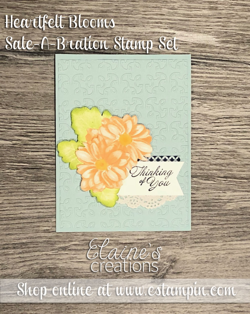 Heartfelt Blooms is another free Sale-A-Bration stamp set with any $50 merchandise order. This amazing stamp set is a new dist”ink”tive stamp created by taking a picture of a real flower arrangement and then transferring it onto a stamp! Amazing! There so many possibilities with this stamp. One use is to stamp in different colors (peekasboo peach for flowers and lemon lime twist for leaves) and then fussy cut the flowers and leaves. Arrange the flowers and leaves and add a sentiment.