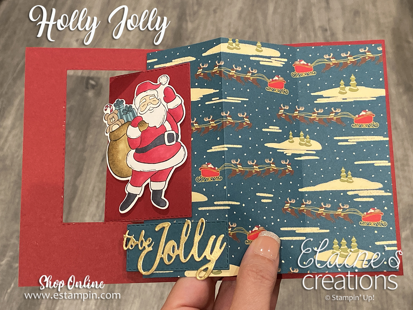 This cute Santa card has a fun fold surprise inside! Open it up to reveal some fun Night Before Christmas Designer Series Paper! Simply start by cutting out a rectangle out of the middle of the card using the Rectangle Stitched Dies. Add some a 5-1/4″ x 6″ piece of Designer Series Paper scored at 2″ and 4″ to the middle of the card. Then attach the rectangle to the Designer Series Paper. Stamp, color, and cut out the Santa to the rectangle and the sentiment to the bottom of the card.