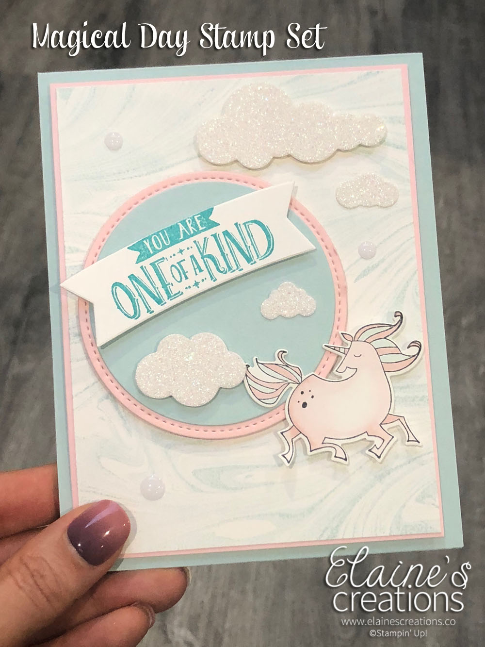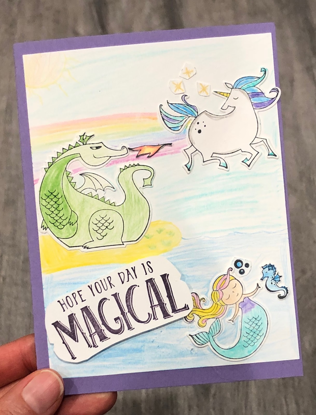 My daughter is in love with unicorns, mermaids, and all things magical. One day she was having a bad day, so I pulled out the Magical Day stamp set for her to make a card with. Her spirits lifted and she happily created a card using the unicorn, mermaid, seahorse and dragon. The next day she gave me the card and said, “Thank you Mommy, for helping me feel better.” Melted my heart. So this Magical Day stamp set is magical to me. 🙂