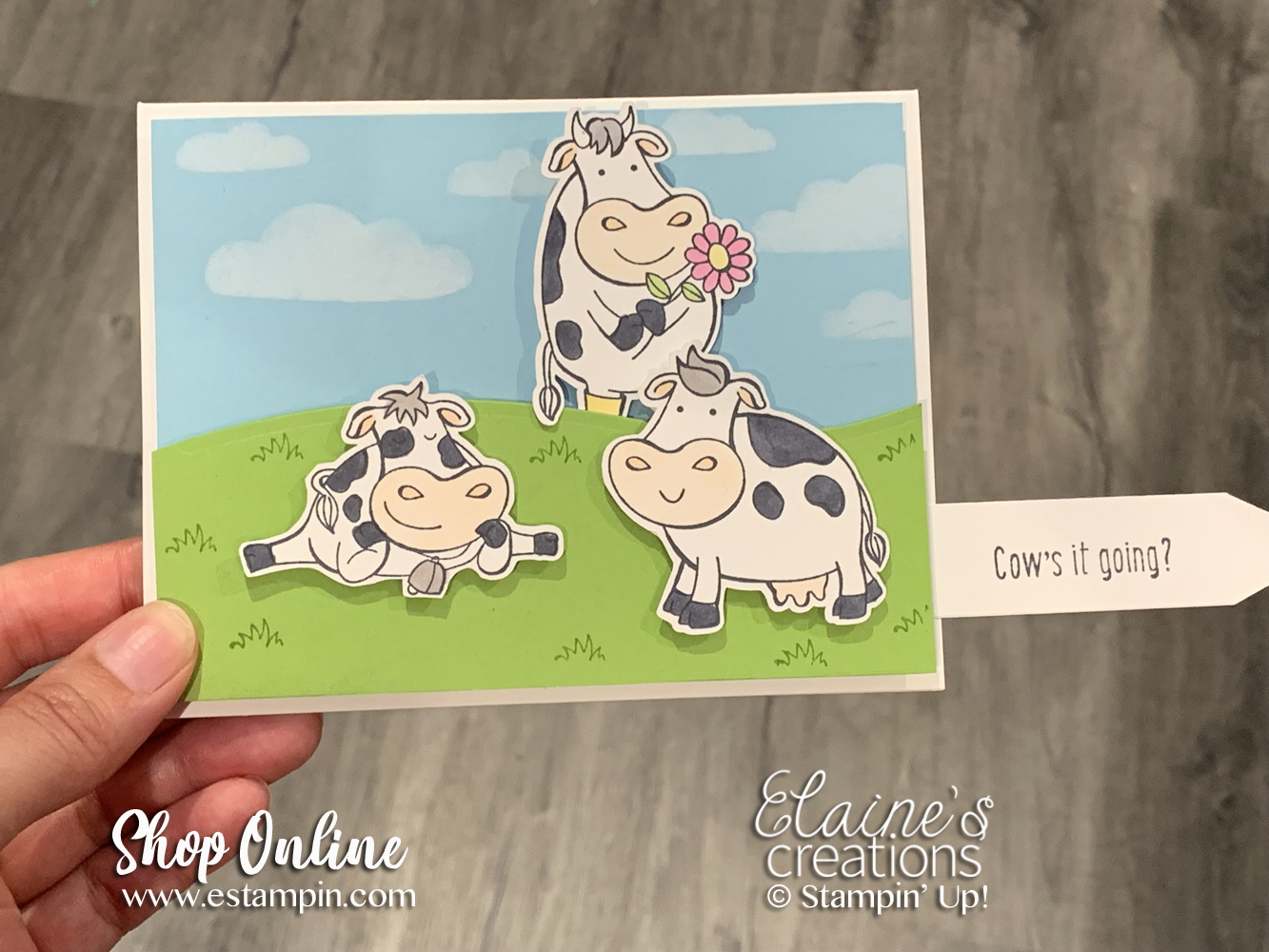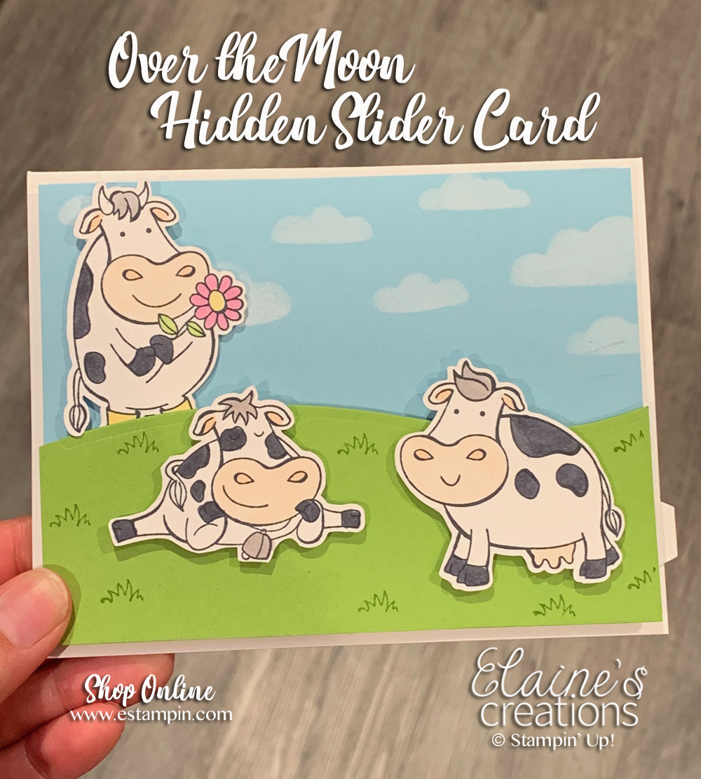 I have a fun treat for you today!  A hidden slider card video tutorial!  I create this cute card with the Over the Moon stamp set.  Love the cows! The cow moooooves across the card. I gave the card to the owner of the new Chick-fil-A down the street – he thought it was great!