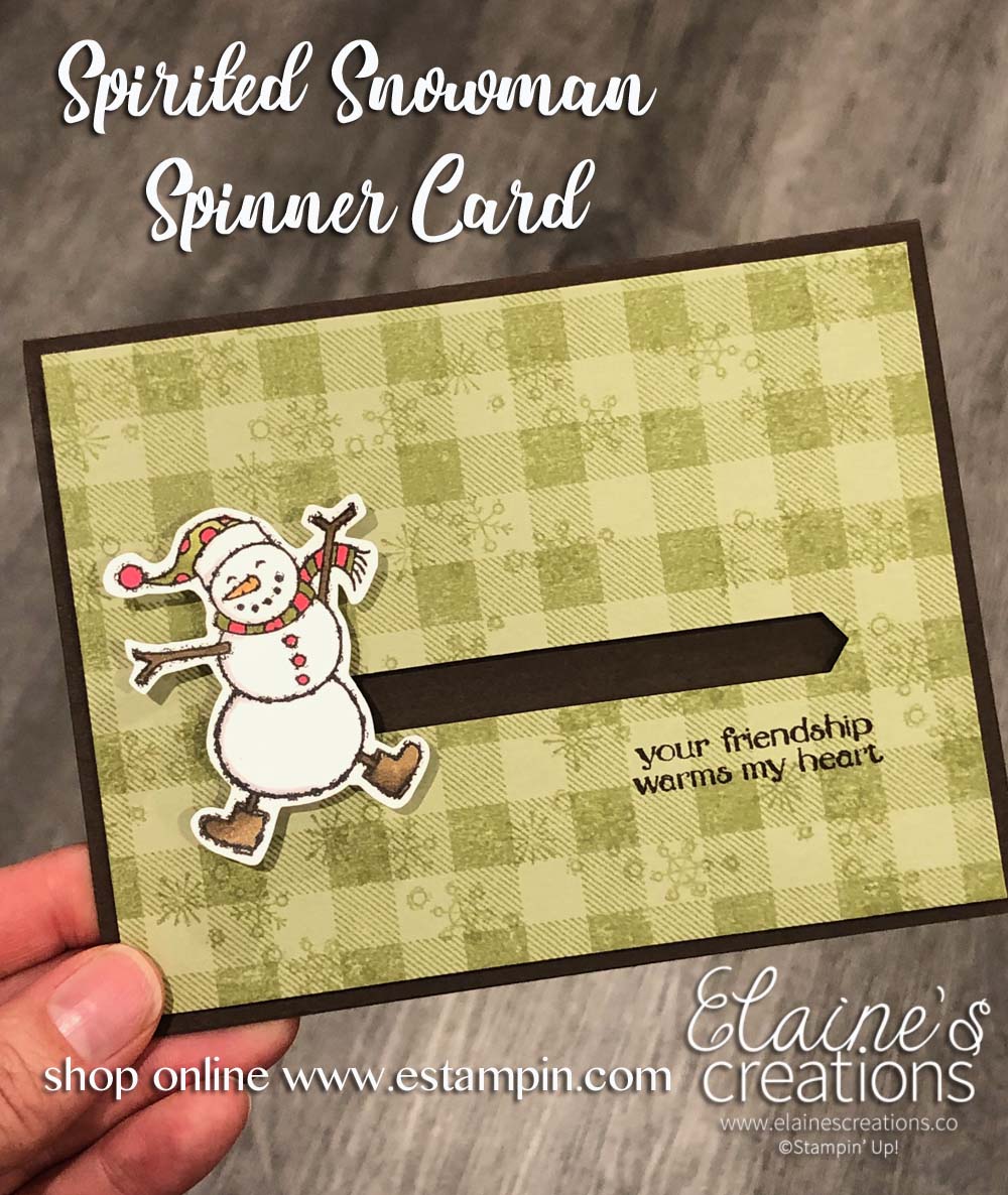 It’s been a while since I made a spinner card. But the magic is still there. I love to watch the snowman do cartwheels down the card over and over again. And my stamp club members loved it too! Watch my FB Live tomorrow (Tuesday) at 9 am to learn how to create this spinner card!