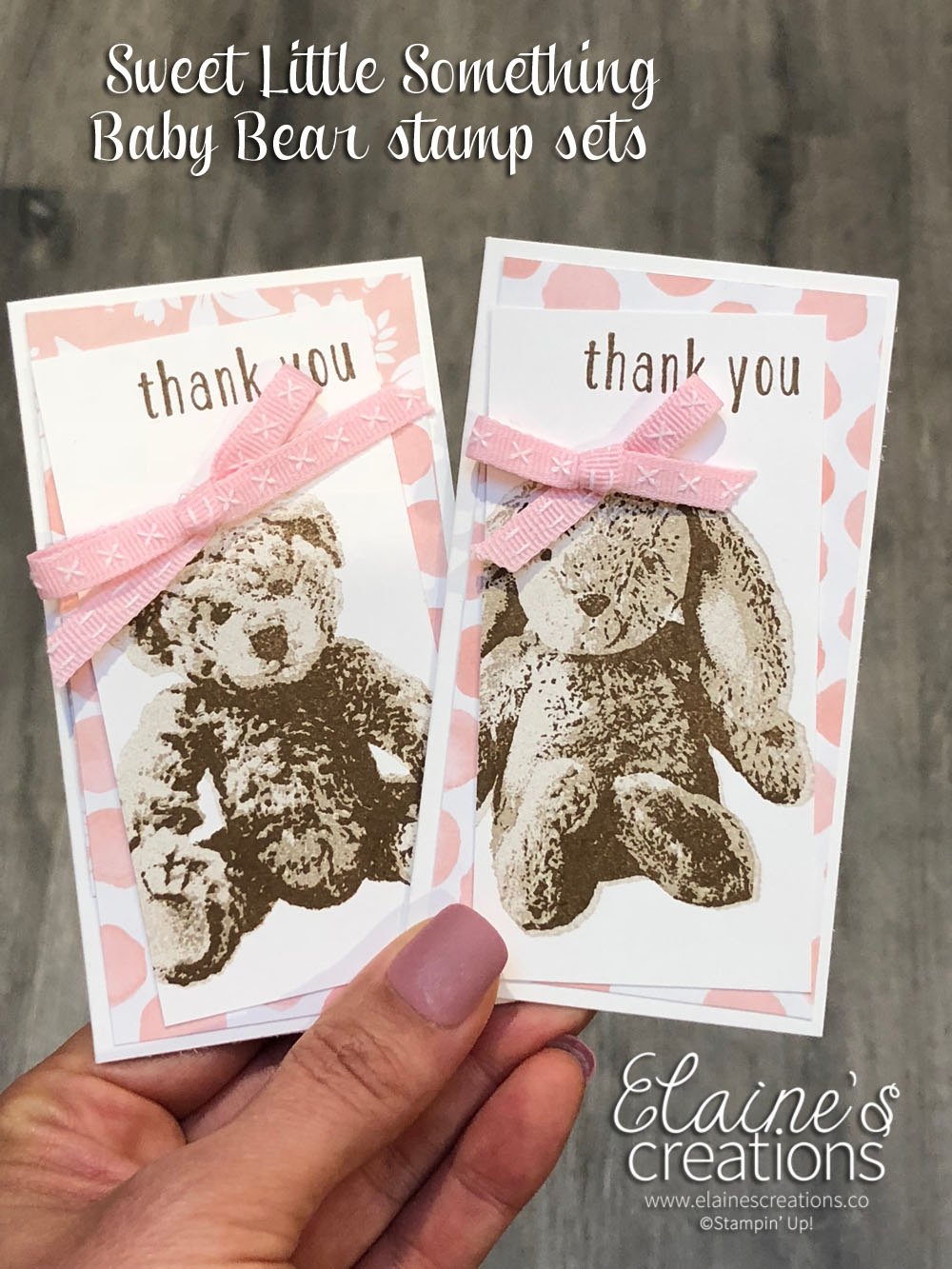 The Sweet Little Something & Baby Bear stamp sets are a perfect fit for the Narrow Notecards! I used Sahara Sand, Crumb Cake, and Soft Suede ink to create the cute a cuddly bunny and bear! I am going to really miss the sweet little bunny when it retires this month!