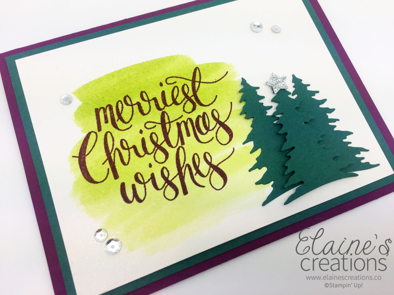 I love watercoloring! I added a splash of color by watercoloring a background with Lemon Lime Twist ink. It adds a nice pop of color and make the sentiment really stand out! I used shimmery white card stock because it really does well with watercoloring. I choose some unusual Christmas colors – what do you think? Do these colors work for Christmas?